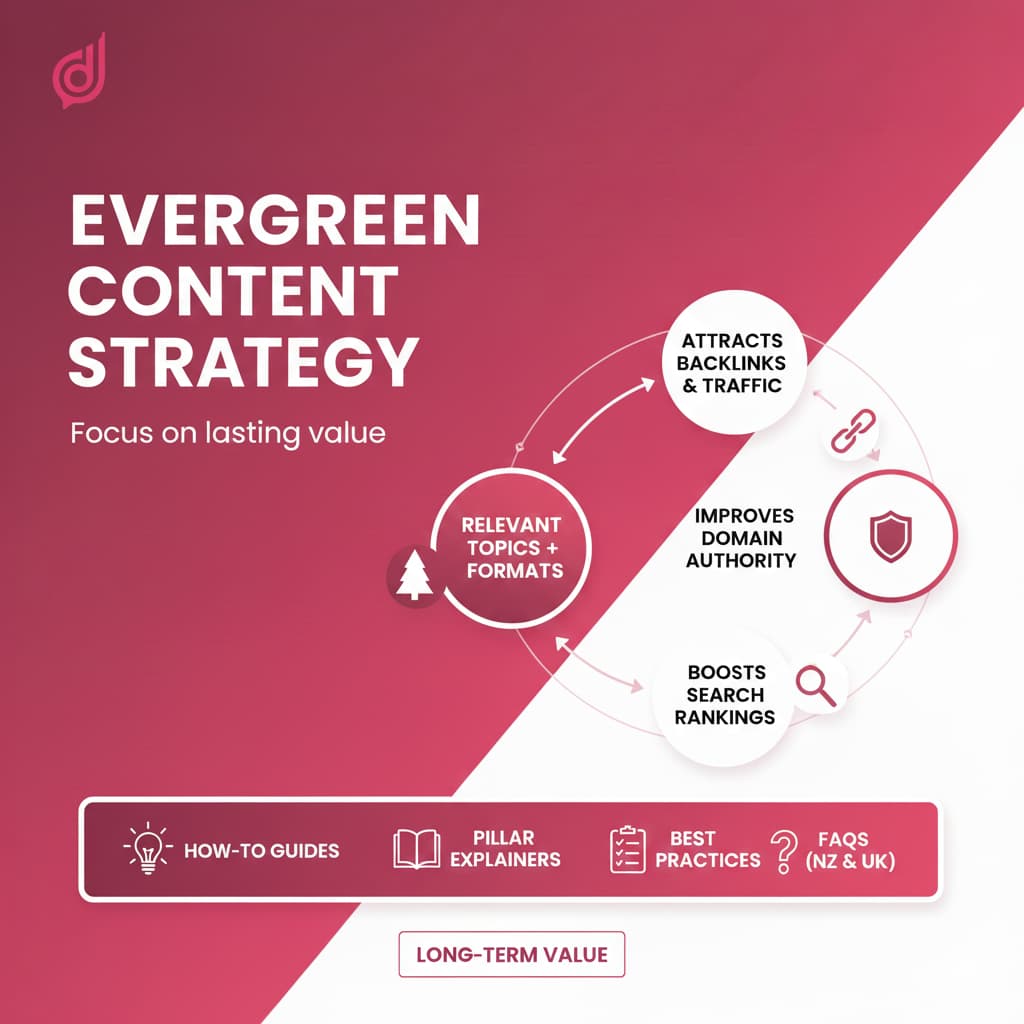 Not every piece deserves to be evergreen; the key is to select topics and formats that naturally stay relevant for years. Studies of billions of articles show that evergreen content consistently attracts backlinks, maintains steady traffic and signals lasting value to search engines, which helps improve domain authority and rankings. Classic evergreen formats include how-to guides, pillar explainers, best practice frameworks and FAQs that answer recurring questions for your NZ and UK audiences.​